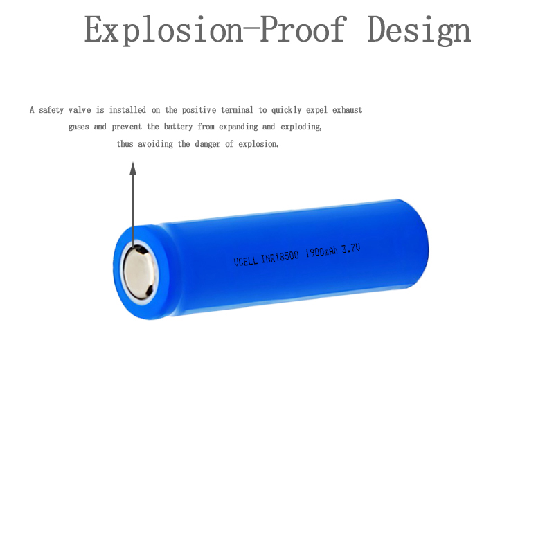 VCELL POWER high quality 3.7V 1900mAh INR18500 lithium ion battery uses lithium nickel manganese cobalt oxide material, resulting in high energy density. Its cylindrical design is compact and offers long-lasting battery life. An explosion-proof valve on the top of the battery quickly releases internal pressure in abnormal situations, effectively preventing battery rupture or fire. High-quality electrode materials and precision manufacturing processes ensure battery life, providing over 700 charge-discharge cycles under standard conditions, offering excellent value. It is widely used in various professional lighting, power tools, medical equipment, security communications, and high-end consumer electronics products.