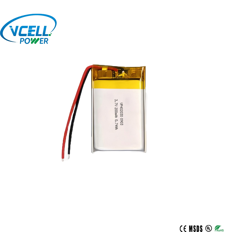 VCELL POWER 3.7V 200mAh 402030 rechargeable li polymer battery is a high-quality, compact power source designed specifically for small devices. Its ultra-thin 4.2mm thickness and ultra-light 5g weight make it easy to install in a variety of miniature electronic devices. This 3.7V 200mAh 402030 rechargeable li polymer battery uses high-quality materials, combined with rigorous manufacturing processes and comprehensive testing procedures to ensure battery quality. And our 3.7V 200mAh 402030 rechargeable li polymer battery features a low self-discharge rate, making it easy to store. Furthermore, this battery can be built-in PCM, providing multiple protections against short circuits, overcharge, and over-discharge, ensuring safety and reliability.
