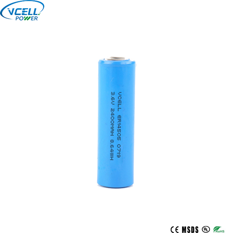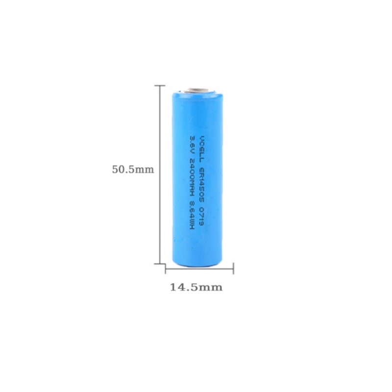 VCELL POWER ER14505 3.6V 2400mAh AA Size Li SOCL2 Battery is a disposable battery featuring a fully sealed design, a stainless steel housing, and metal-glass sealing and airtight welding technology, ensuring safety and reliability. Its standard AA size makes it compatible with a wide range of common devices. Its wide operating temperature range of -55°C to +85°C ensures stable operation in a variety of environments. Its annual self-discharge rate is less than 1%, and its storage life at room temperature can reach over 10 years, significantly reducing equipment maintenance and offering a cost-effective and economical performance. Its high energy density and ultra-long life make it an ideal power solution for IoT, smart meters, and other fields.